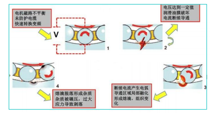 以上原因產(chǎn)生的軸電壓雖然微小,但當(dāng)量值達(dá)到足以擊穿軸承潤滑油膜時,瞬間將依次經(jīng)過軸承內(nèi)圈、滾動體、外圈與電機定子機座構(gòu)成回路(屬稱過電流),并產(chǎn)生電火花。一旦出現(xiàn)過電流現(xiàn)象,軸承滾道或滾動體在電流導(dǎo)通區(qū)域會形成熔滴狀破壞性表面,造成軸承提前失效.